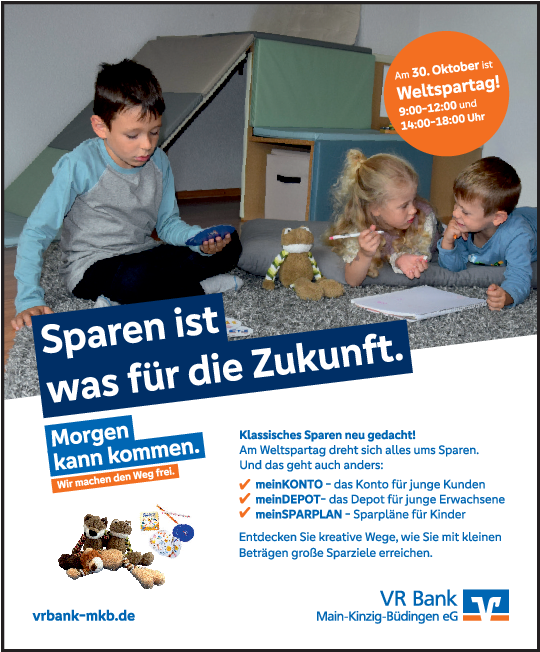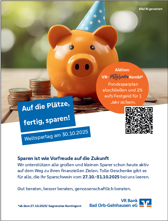 Am Weltspartag, Donnerstag, 30. Oktober 2025, lädt die VR Bank Main-Kinzig-Büdingen von 9 bis 12 Uhr und von 14 bis 18 Uhr in ihre Geschäftsstellen ein. Junge Sparer dürfen sich auf kleine Geschenke freuen, während Eltern bei einer Tasse Kaffee erfahren, wie modernes Sparen funktioniert.