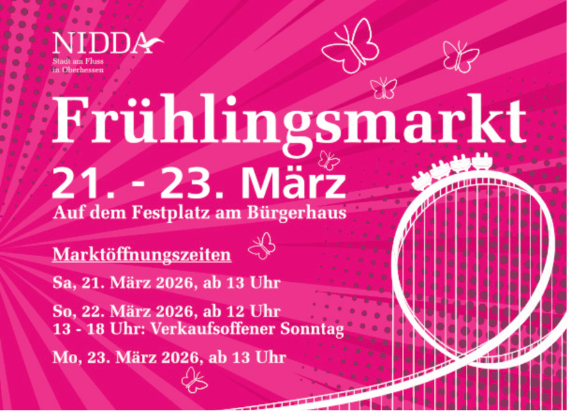 Der Magistrat der Stadt Nidda mit Thorsten Eberhard als Bürgermeister lädt alle Bürgerinnen und Bürger der Großgemeinde, aber auch Gäste aus der ganzen Region herzlich dazu ein, an diesem Frühlingsmarktwochenende ein paar entspannte und unterhaltsame Stunden in Nidda zu verbringen.