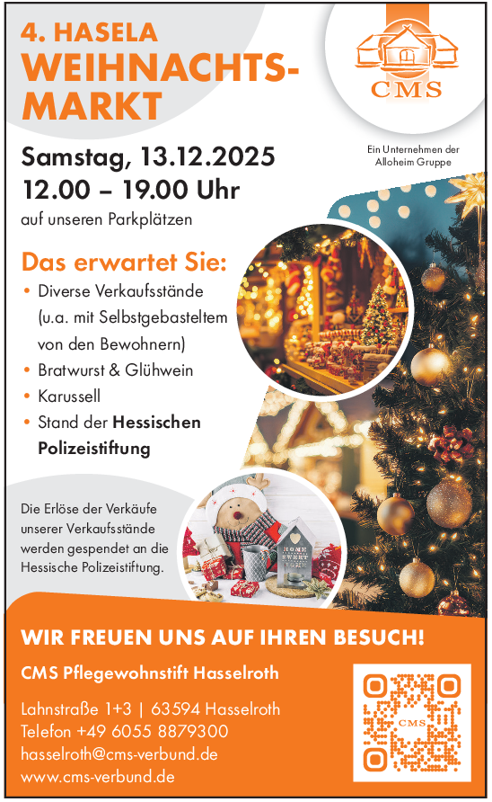 Das Team des CMS-Pflegewohnstifts Hasselroth veranstaltet am Samstag, 13. Dezember, den 4. Hasela-Weihnachtsmarkt vor dem Seniorenzentrum in Neuenhaßlau. Die Gäste können von 12 bis 19 Uhr an diversen Verkaufsständen Selbstgebasteltes von den Bewohnern erwerben und bei einer Tasse Glühwein und einer Bratwurst in der hektischen Vorweihnachtszeit eine Auszeit nehmen. Die Kinderwerden sich vor allem auf das Karussell freuen. Der Erlös des Marktes kommt der Hessischen Polizeistiftung zugute, die ebenfalls mit einem Standvertreten sein wird.