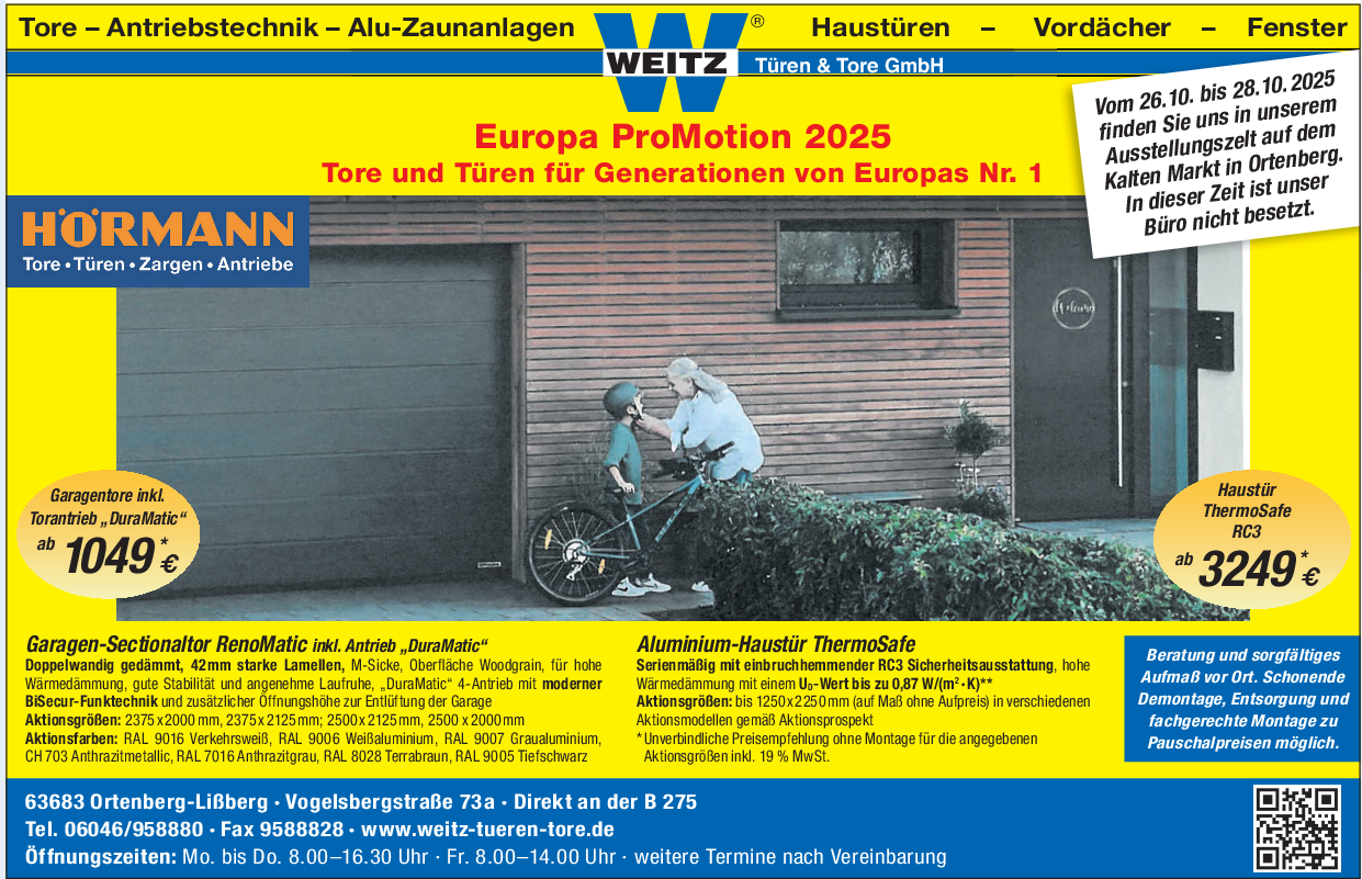 Ortenberg: Die WEITZ Türen und Tore GmbH bietet Garagen-Sektionaltore und Haustüren zu Aktionspreisen an.